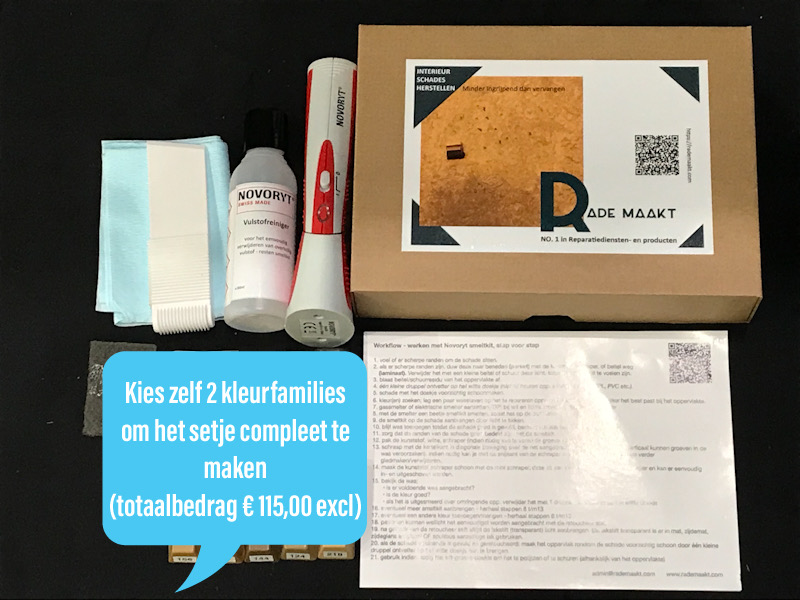 In de basis treft u de smelter, schraper, vulstof reiniger, ontvettingsdoek en schuurdoekjes. De smeltkit kunt u zelf kiezen, waarmee u het setje compleet maakt. Er passen maximaal 10 staafjes in dit setje.
